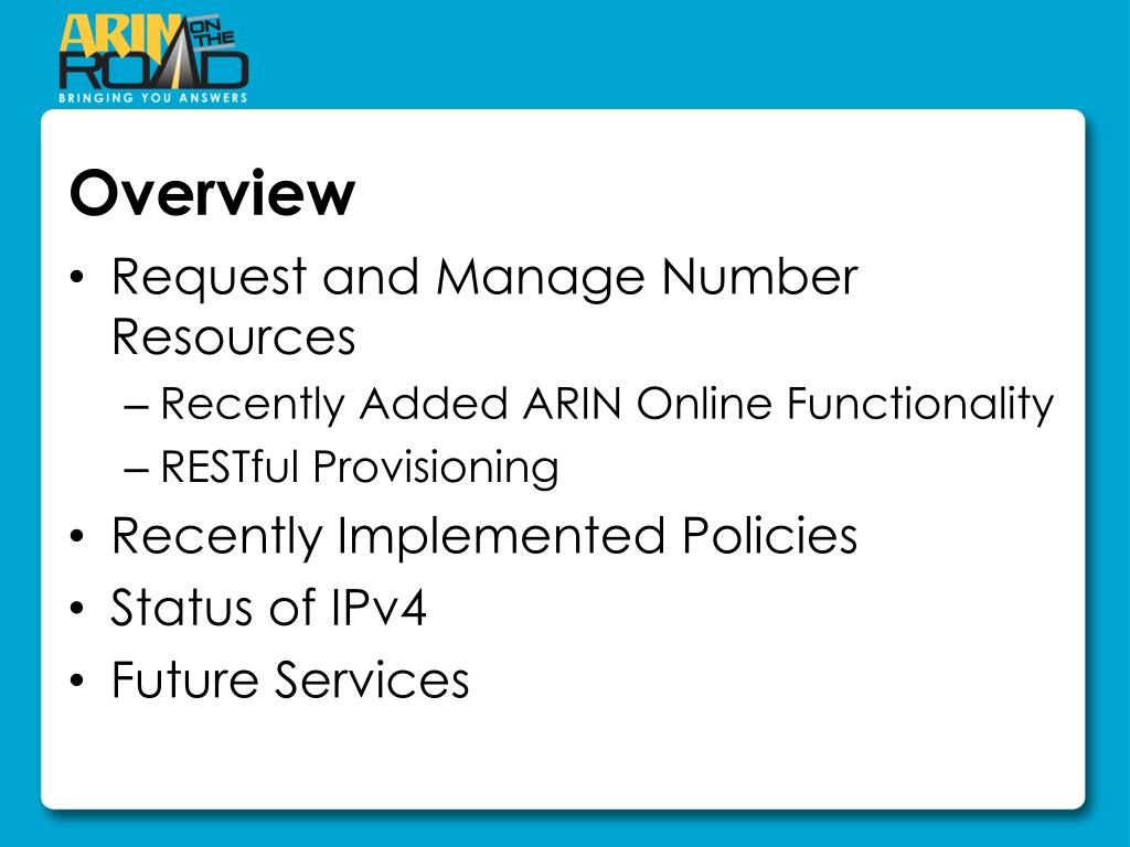 Overview • Request and Manage Number Resources • Recently Added ARIN Online Functionality • RESTful Provisioning • Recently Implemented Policies • Status of IPv4 • Future Services