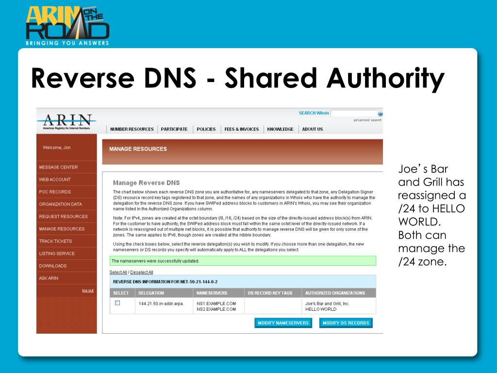 Reverse DNS - Shared Authority Joe’s Bar and Grill has reassigned a /24 to HELLO WORLD. Both can manage the /24 zone.