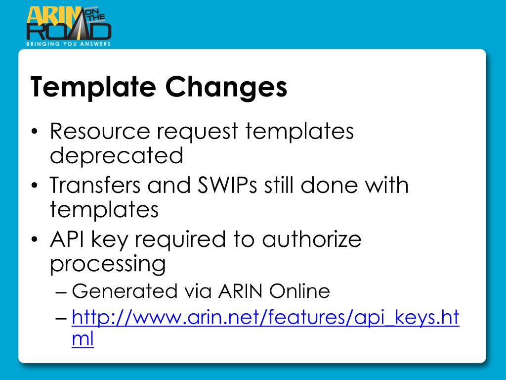 Template Changes • Resource request templates deprecated • Transfers and SWIPs still done with templates • API key required to authorize processing • Generated via ARIN Online • http://www.arin.net/features/api_keys.html