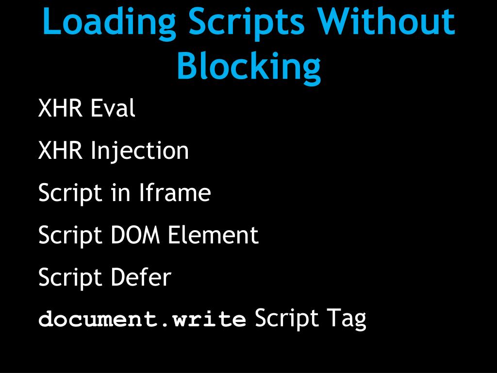 Loading Scripts Without Blocking XHR Eval XHR Injection Script in Iframe Script DOM Element Script Defer document.write Script Tag