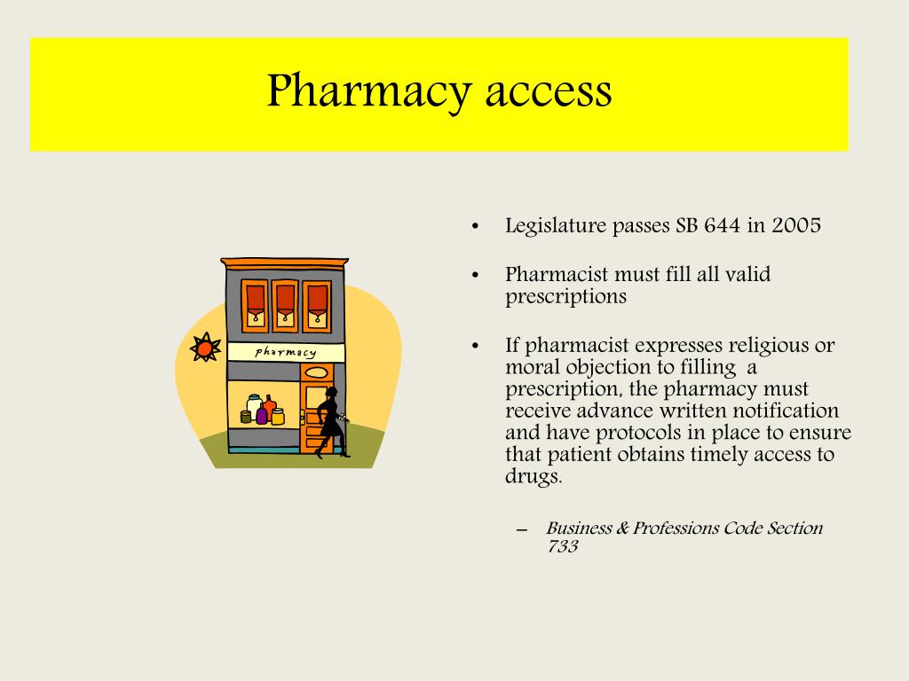 Pharmacy access • Legislature passes SB 644 in 2005 • Pharmacist must fill all valid prescriptions • If pharmacist expresses religious or moral objection to filling a prescription, the pharmacy must receive advance written notification and have protocols in place to ensure that patient obtains timely access to drugs. • Business & Professions Code Section 733
