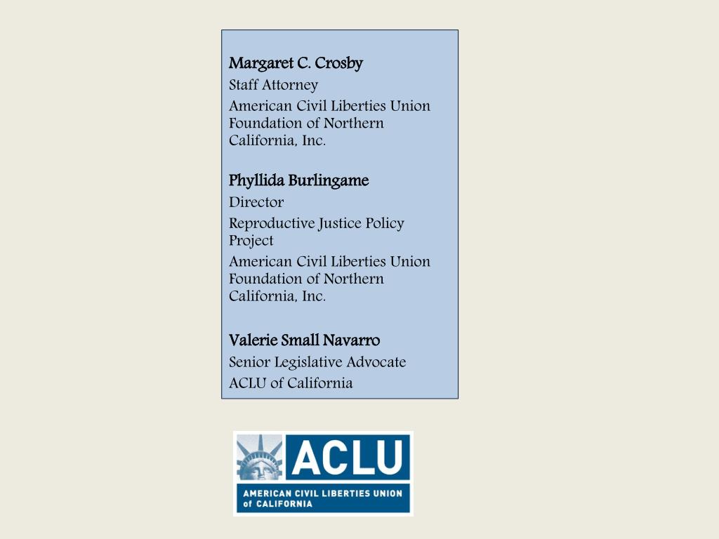 Margaret C. Crosby Staff Attorney American Civil Liberties Union Foundation of Northern California, Inc. Phyllida Burlingame Director Reproductive Justice Policy Project American Civil Liberties Union Foundation of Northern California, Inc. Valerie Small Navarro Senior Legislative Advocate ACLU of California