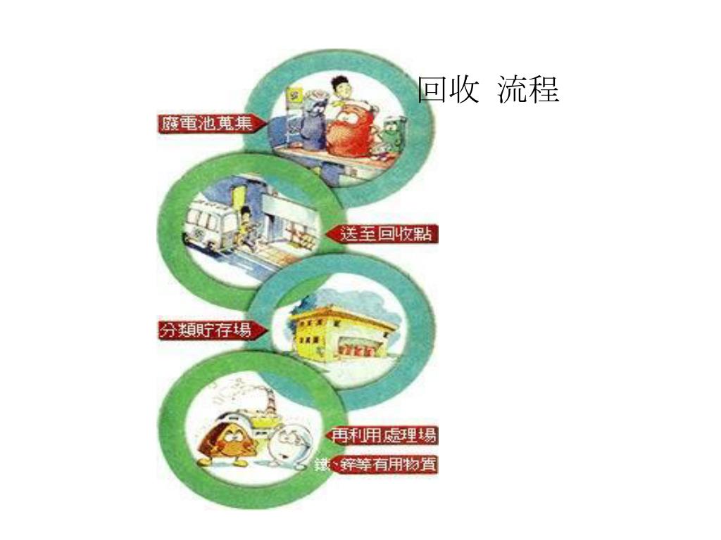 生活中產生廢電池的來源 隨身聽、手電筒、遙控器、 玩具等用的圓筒型電池(碳鋅電池、鹼性電池) 手錶、電腦主機板(氧化銀、氧化汞電池)、 照相機(鋰電池) 助聽器(鋅空氣電池) 大哥大(鎳鎘、鎳氫、鋰電池)