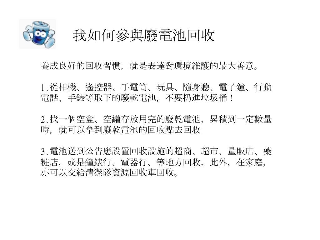 我如何參與廢電池回收 養成良好的回收習慣,就是表達對環境維護的最大善意。 1.從相機、遙控器、手電筒、玩具、隨身聽、電子鐘、行動電話、手錶等取下的廢乾電池,不要扔進垃圾桶! 2.找一個空盒、空罐存放用完的廢乾電池,累積到一定數量時,就可以拿到廢乾電池的回收點去回收 3.電池送到公告應設置回收設施的超商、超市、量販店、藥粧店,或是鐘錶行、電器行、等地方回收。此外,在家庭,亦可以交給清潔隊資源回收車回收。
