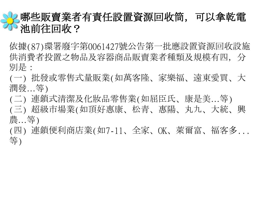 哪些販賣業者有責任設置資源回收筒,可以拿乾電池前往回收?哪些販賣業者有責任設置資源回收筒,可以拿乾電池前往回收? 依據(87)環署廢字第0061427號公告第一批應設置資源回收設施供消費者投置之物品及容器商品販賣業者種類及規模有四,分別是: (一) 批發或零售式量販業(如萬客隆、家樂福、遠東愛買、大潤發…等) (二) 連鎖式清潔及化妝品零售業(如屈臣氏、康是美…等) (三) 超級市場業(如頂好惠康、松青、惠陽、丸九、大統、興農…等) (四) 連鎖便利商店業(如7-11、全家、OK、萊爾富、福客多...等)
