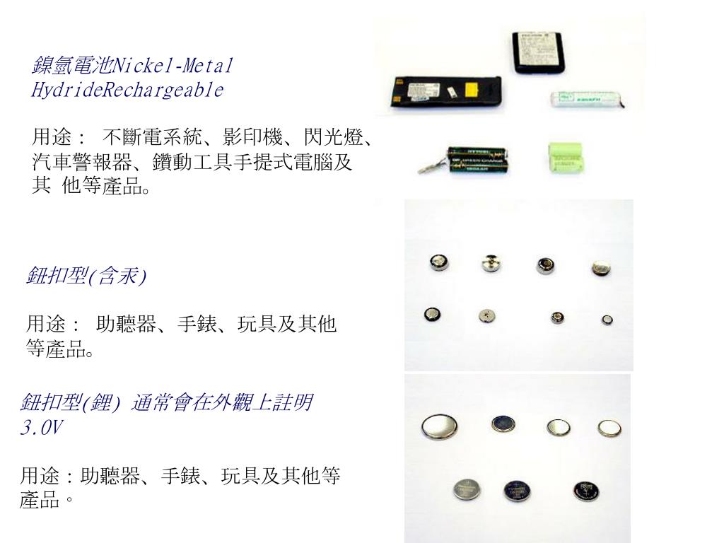 鎳氫電池Nickel-Metal HydrideRechargeable用途: 不斷電系統、影印機、閃光燈、汽車警報器、鑽動工具手提式電腦及其 他等產品。 鈕扣型(含汞)用途: 助聽器、手錶、玩具及其他等產品。 鈕扣型(鋰) 通常會在外觀上註明3.0V用途:助聽器、手錶、玩具及其他等產品。