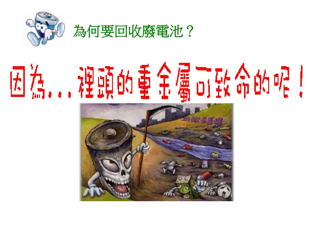 廢電池危害人類的招數 第一招; 據研究報告指出,單單一顆一號電池爛在泥土裏,就會使 1 平方公尺的土壤永久失去利用價值;一粒鈕扣電池就會使 600噸水無法飲用,相當於一個人一生的飲水量。 第二招;對自然環境威脅最大的五種物質,電池裡就包含了汞、鉛、鎘三種,若將廢電池混入生活垃圾一起填埋,滲出的汞及重金屬物質會滲透土壤、污染地下水,進而進入魚類身體、農作物中,間接威脅到人類的健康。 第三招;危害健康:人體透過食物鏈吸收重金屬,會危害身體健康 。