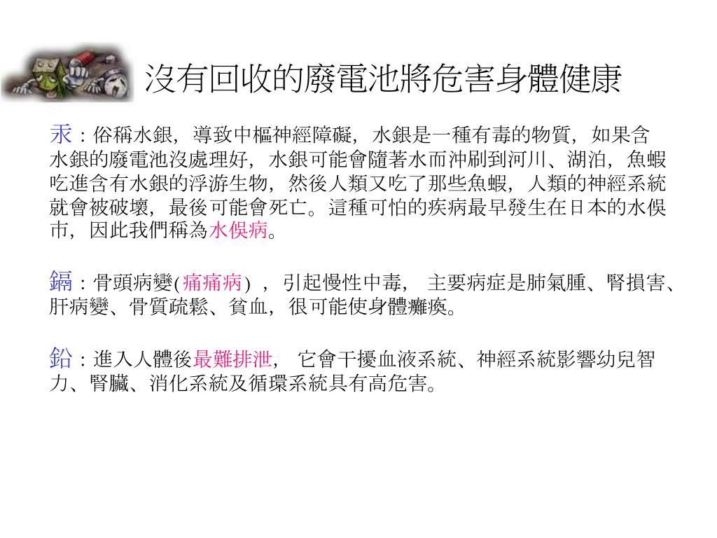 沒有回收的廢電池將危害身體健康 汞:俗稱水銀,導致中樞神經障礙,水銀是一種有毒的物質,如果含水銀的廢電池沒處理好,水銀可能會隨著水而沖刷到河川、湖泊,魚蝦吃進含有水銀的浮游生物,然後人類又吃了那些魚蝦,人類的神經系統就會被破壞,最後可能會死亡。這種可怕的疾病最早發生在日本的水俁市,因此我們稱為水俁病。 鎘:骨頭病變(痛痛病) ,引起慢性中毒,主要病症是肺氣腫、腎損害、肝病變、骨質疏鬆、貧血,很可能使身體癱瘓。 鉛:進入人體後最難排泄,它會干擾血液系統、神經系統影響幼兒智力、腎臟、消化系統及循環系統具有高危害。