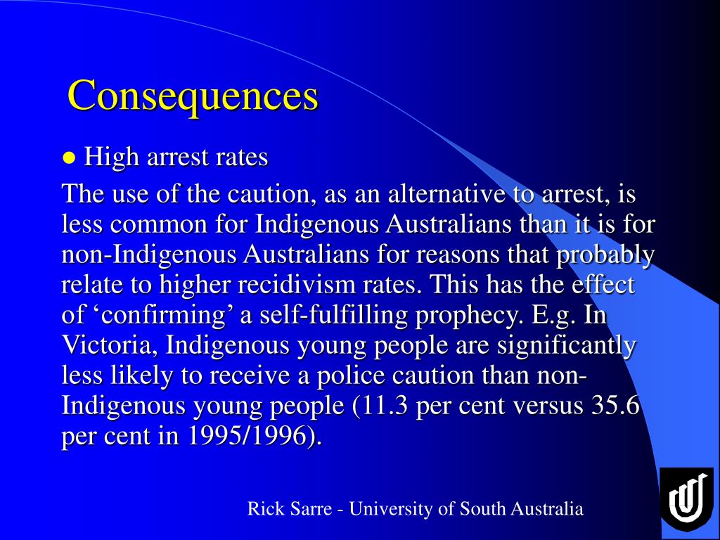 Consequences • High arrest rates The use of the caution, as an alternative to arrest, is less common for Indigenous Australians than it is for non-Indigenous Australians for reasons that probably relate to higher recidivism rates. This has the effect of ‘confirming’ a self-fulfilling prophecy. E.g. In Victoria, Indigenous young people are significantly less likely to receive a police caution than non-Indigenous young people (11.3 per cent versus 35.6 per cent in 1995/1996).