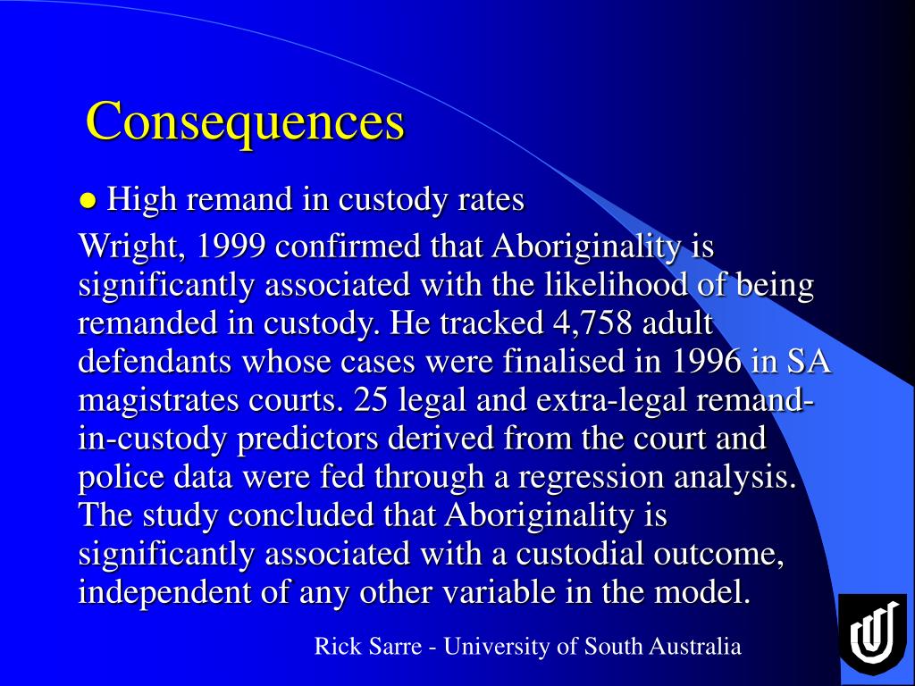 Consequences • High remand in custody rates Wright, 1999 confirmed that Aboriginality is significantly associated with the likelihood of being remanded in custody. He tracked 4,758 adult defendants whose cases were finalised in 1996 in SA magistrates courts. 25 legal and extra-legal remand-in-custody predictors derived from the court and police data were fed through a regression analysis. The study concluded that Aboriginality is significantly associated with a custodial outcome, independent of any other variable in the model.