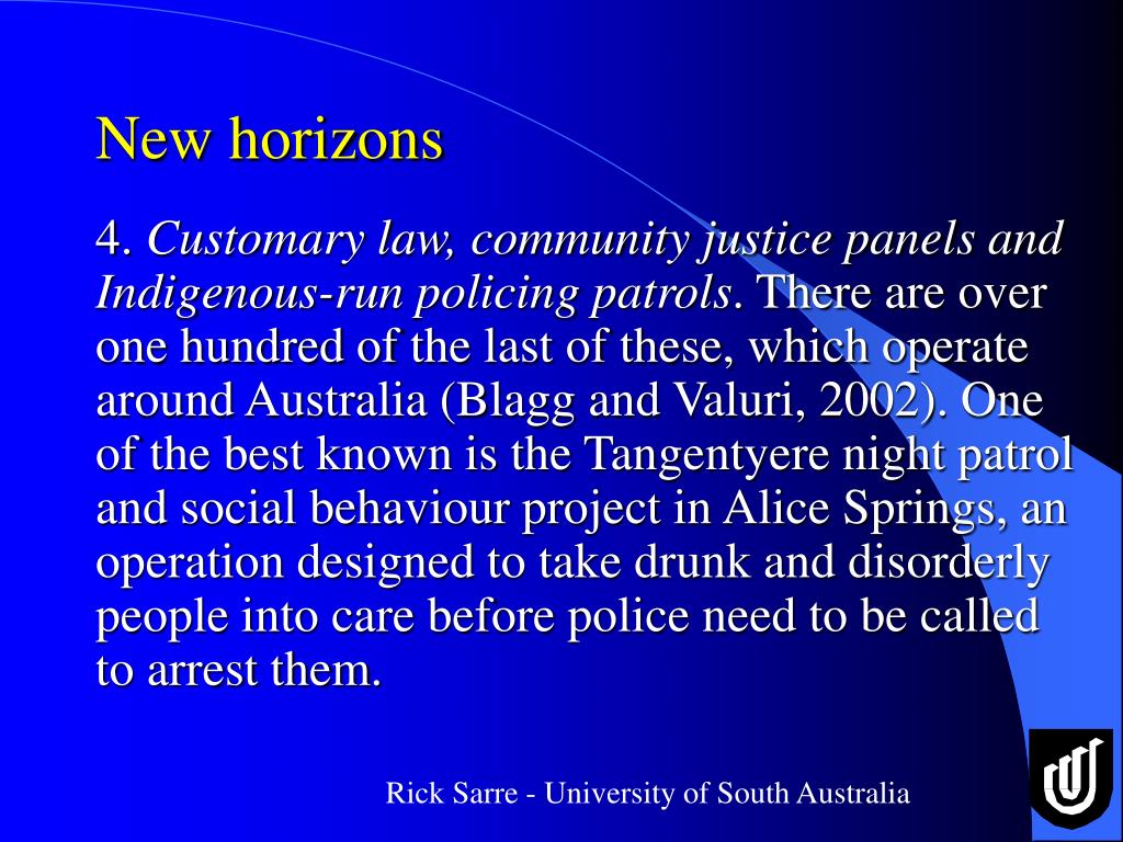 New horizons 4. Customary law, community justice panels and Indigenous-run policing patrols. There are over one hundred of the last of these, which operate around Australia (Blagg and Valuri, 2002). One of the best known is the Tangentyere night patrol and social behaviour project in Alice Springs, an operation designed to take drunk and disorderly people into care before police need to be called to arrest them.