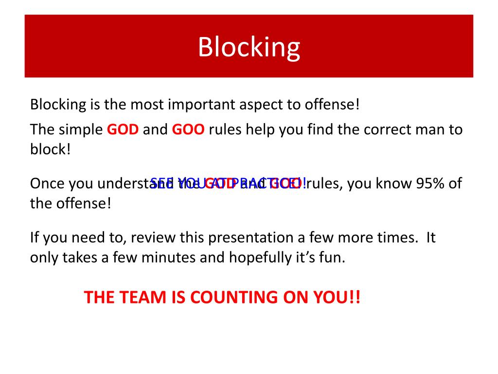 Blocking Blocking is the most important aspect to offense! The simple GOD and GOO rules help you find the correct man to block! Once you understand the GOD and GOO rules, you know 95% of the offense! SEE YOU AT PRACTICE!! If you need to, review this presentation a few more times. It only takes a few minutes and hopefully it’s fun. THE TEAM IS COUNTING ON YOU!!