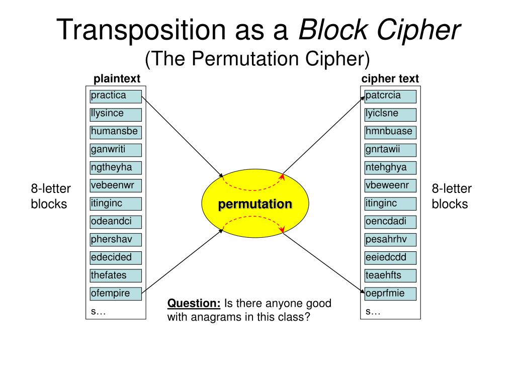 Transposition as a Block Cipher(The Permutation Cipher) plaintext cipher text practica llysince humansbe ganwriti ngtheyha vebeenwr itinginc odeandci phershav edecided thefates ofempire s… patcrcia lyiclsne hmnbuase gnrtawii ntehghya vbeweenr itinginc oencdadi pesahrhv eeiedcdd teaehfts oeprfmie s… permutation 8-letter blocks 8-letter blocks Question: Is there anyone good with anagrams in this class?
