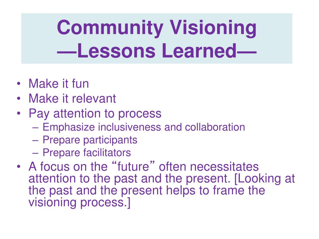 Community Visioning—Lessons Learned— • Make it fun • Make it relevant • Pay attention to process • Emphasize inclusiveness and collaboration • Prepare participants • Prepare facilitators • A focus on the “future” often necessitates attention to the past and the present. [Looking at the past and the present helps to frame the visioning process.]