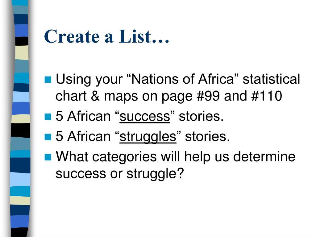 Create a List… • Using your “Nations of Africa” statistical chart & maps on page #99 and #110 • 5 African “success” stories. • 5 African “struggles” stories. • What categories will help us determine success or struggle?