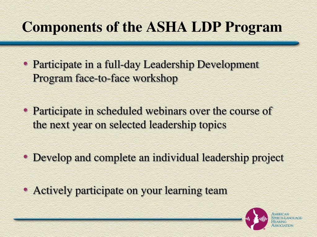 Leadership Development Program • If you want to… • Expand and refine your leadership skills to drive change in your current work setting • Become a leader within your state or professional association • Build a lifelong professional network • Give back to your profession through volunteer service • Influence policies, programs and services • THEN the ASHA LDP program is for YOU!