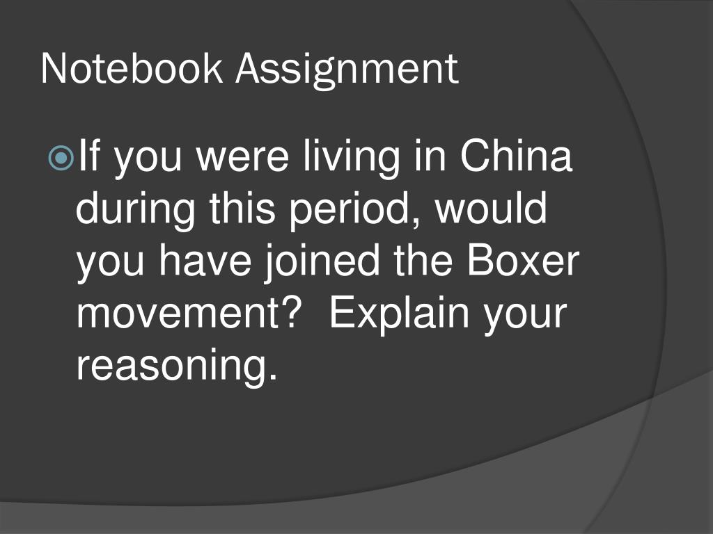 Notebook Assignment • If you were living in China during this period, would you have joined the Boxer movement? Explain your reasoning.
