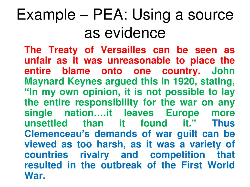 Example – PEA: Using a source as evidence The Treaty of Versailles can be seen as unfair as it was unreasonable to place the entire blame onto one country. John Maynard Keynes argued this in 1920, stating, “In my own opinion, it is not possible to lay the entire responsibility for the war on any single nation….it leaves Europe more unsettled than it found it.” Thus Clemenceau’s demands of war guilt can be viewed as too harsh, as it was a variety of countries rivalry and competition that resulted in the outbreak of the First World War.