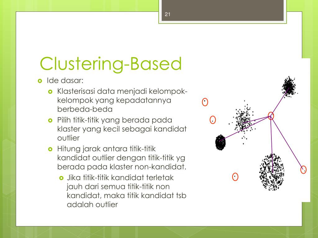 Clustering-Based • Ide dasar: • Klasterisasi data menjadikelompok-kelompok yang kepadatannyaberbeda-beda • Pilihtitik-titik yang beradapadaklaster yang kecilsebagaikandidat outlier • Hitungjarakantaratitik-titikkandidat outlier dengantitik-titikygberadapadaklaster non-kandidat. • Jikatitik-titikkandidatterletakjauhdarisemuatitik-titik non kandidat, makatitikkandidattsbadalah outlier