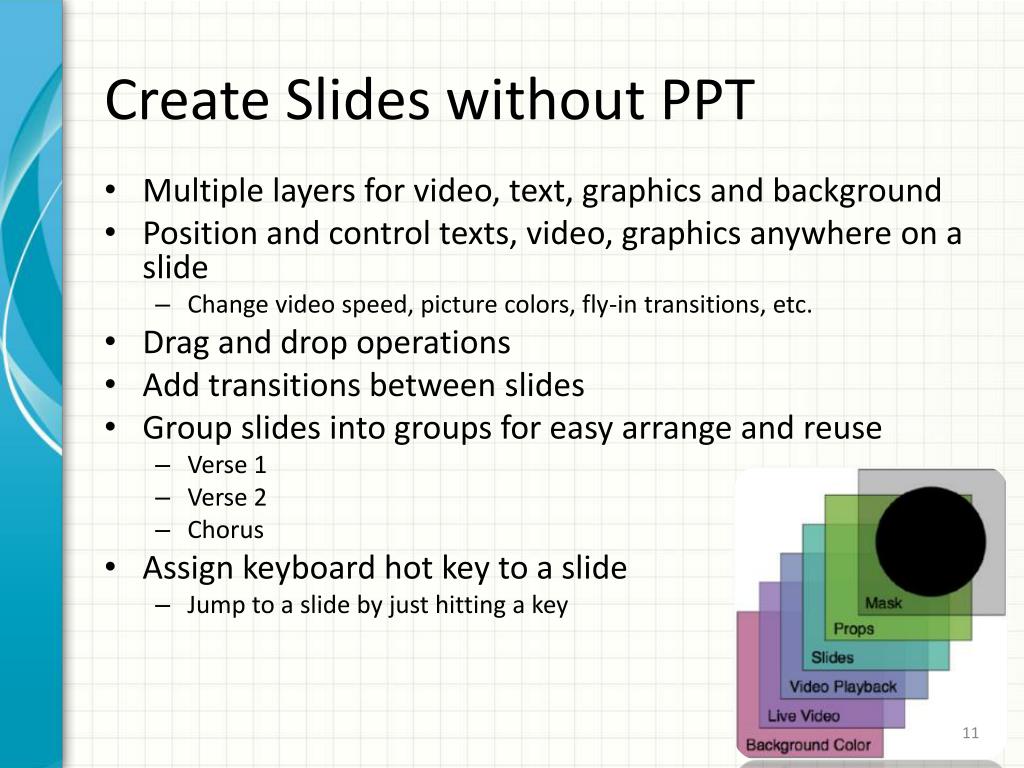 Create Slides without PPT • Multiple layers for video, text, graphics and background • Position and control texts, video, graphics anywhere on a slide • Change video speed, picture colors, fly-in transitions, etc. • Drag and drop operations • Add transitions between slides • Group slides into groups for easy arrange and reuse • Verse 1 • Verse 2 • Chorus • Assign keyboard hot key to a slide • Jump to a slide by just hitting a key