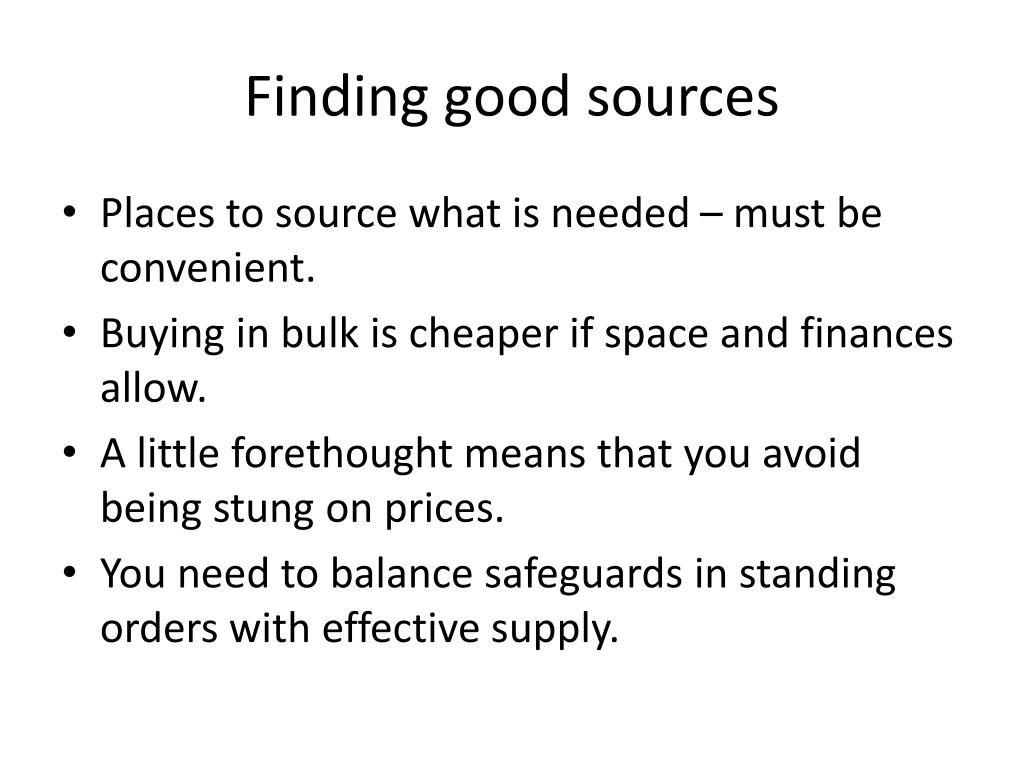 Finding good sources • Places to source what is needed – must be convenient. • Buying in bulk is cheaper if space and finances allow. • A little forethought means that you avoid being stung on prices. • You need to balance safeguards in standing orders with effective supply.