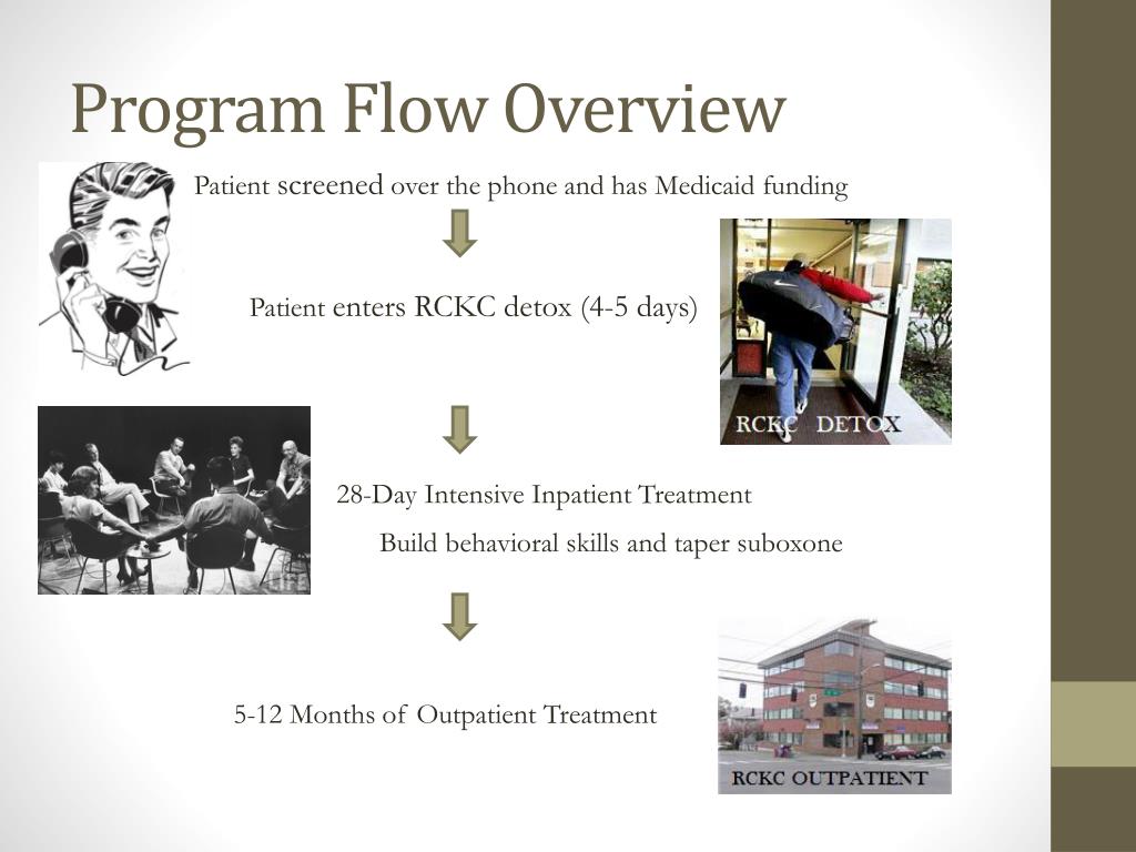 Program Flow Overview Patient screened over the phone and has Medicaid funding Patient enters RCKC detox (4-5 days) 28-Day Intensive Inpatient Treatment Build behavioral skills and taper suboxone 5-12 Months of Outpatient Treatment
