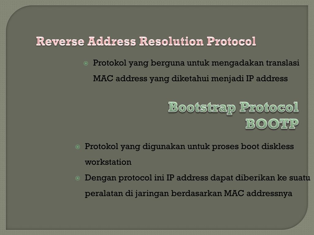 Reverse Address Resolution Protocol Protokol yang bergunauntukmengadakantranslasi MAC address yang diketahuimenjadi IP address Bootstrap Protocol BOOTP Protokol yang digunakanuntuk proses boot diskless workstation Dengan protocol ini IP address dapatdiberikankesuatuperalatan di jaringanberdasarkan MAC addressnya