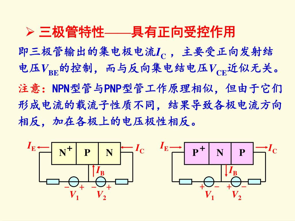 + N P N IE IE + IC IC P N P IB IB - + - + +- +- V1 V2 V1 V2 • 三极管特性——具有正向受控作用 即三极管输出的集电极电流IC,主要受正向发射结电压VBE的控制,而与反向集电结电压VCE近似无关。 注意:NPN型管与PNP型管工作原理相似,但由于它们形成电流的载流子性质不同,结果导致各极电流方向相反,加在各极上的电压极性相反。
