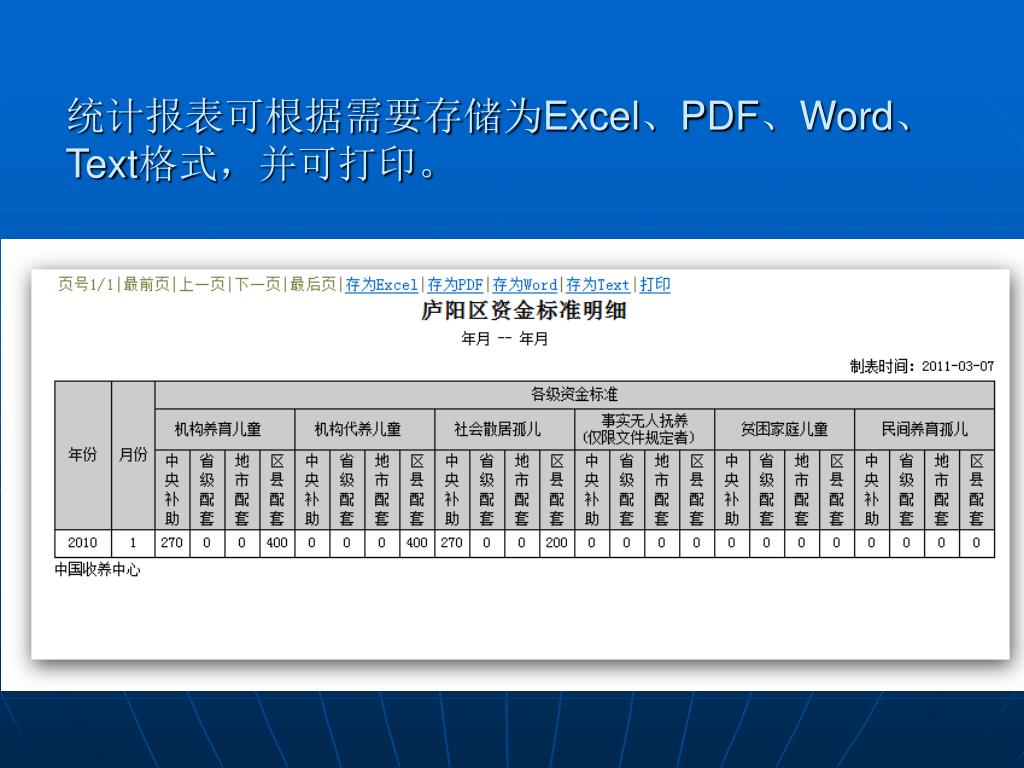 该系统采用准五级管理模式、六类服务对象。即中央级、省级、地市级、县级和其他福利机构,采用规范的编码规则对福利机构养育儿童、福利机构代养儿童、社会散居孤儿、事实无人抚养儿童、民间养育孤儿、贫困家庭儿童的信息进行采集、以实现数据上报、审核、查询、统计分析、生活费发放计算、生活费发放到位核查等基本功能。