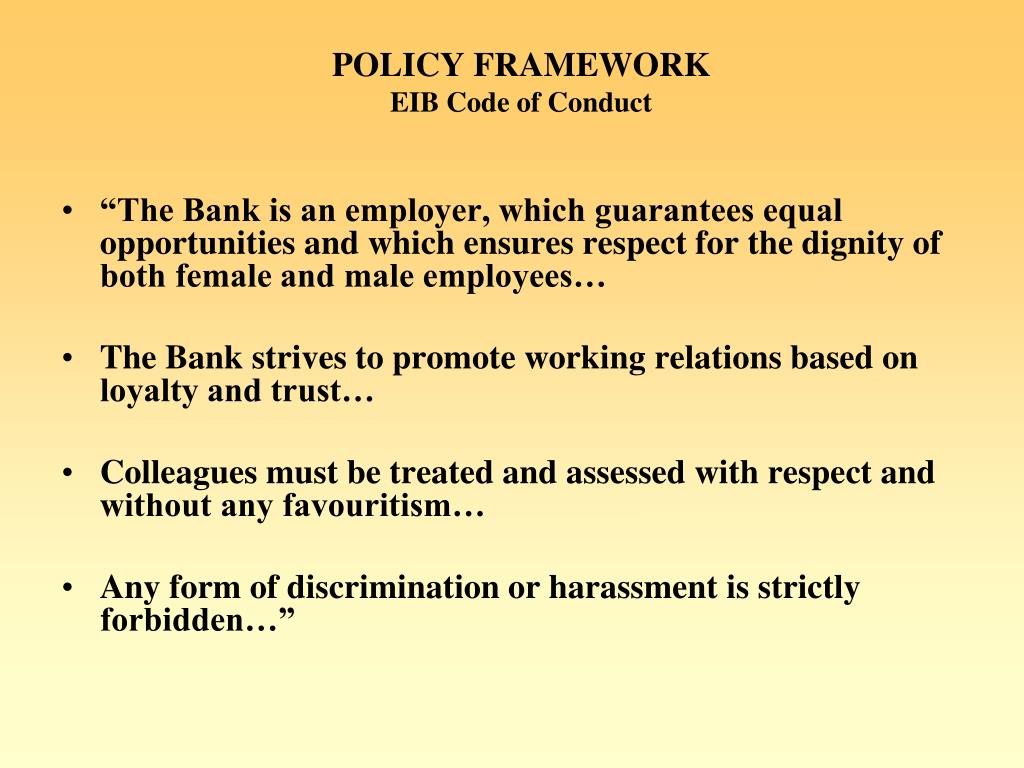 POLICY FRAMEWORKEIB Code of Conduct • “The Bank is an employer, which guarantees equal opportunities and which ensures respect for the dignity of both female and male employees… • The Bank strives to promote working relations based on loyalty and trust… • Colleagues must be treated and assessed with respect and without any favouritism… • Any form of discrimination or harassment is strictly forbidden…”
