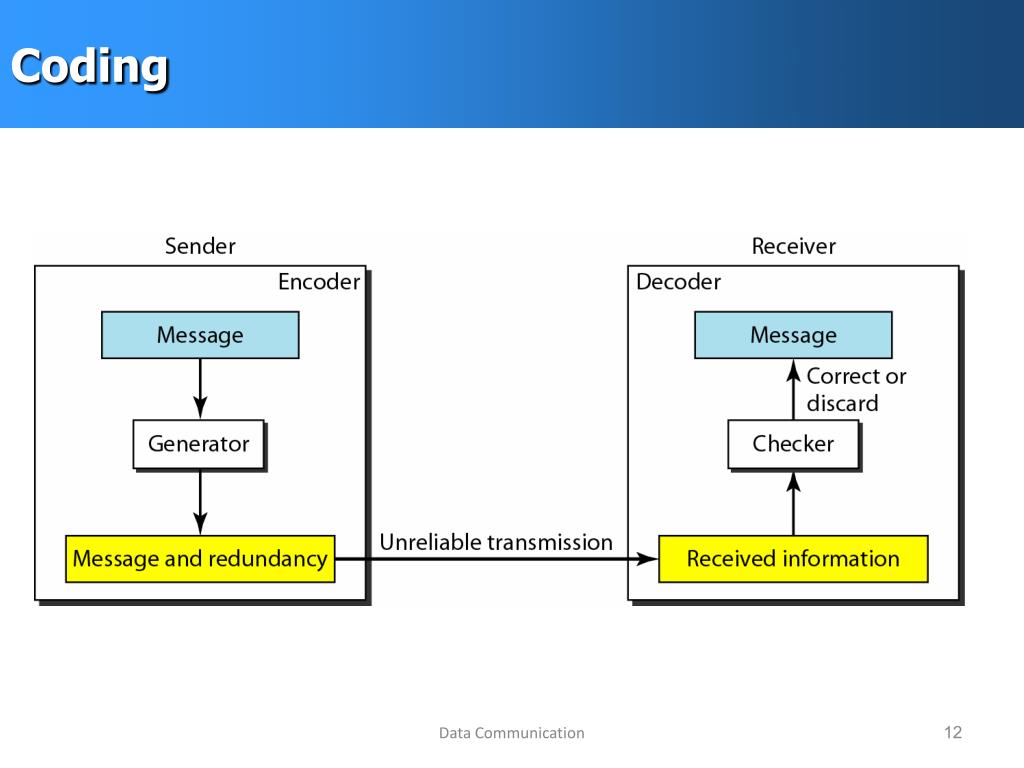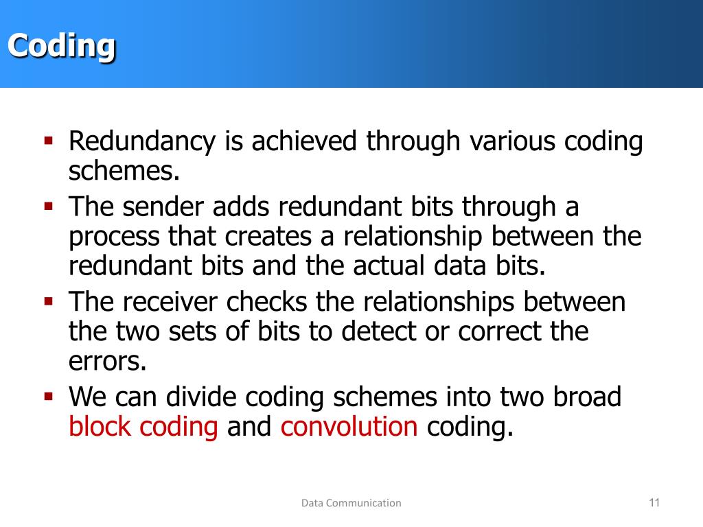 Coding • Redundancy is achieved through various coding schemes. • The sender adds redundant bits through a process that creates a relationship between the redundant bits and the actual data bits. • The receiver checks the relationships between the two sets of bits to detect or correct the errors. • We can divide coding schemes into two broad block coding and convolution coding. Data Communication