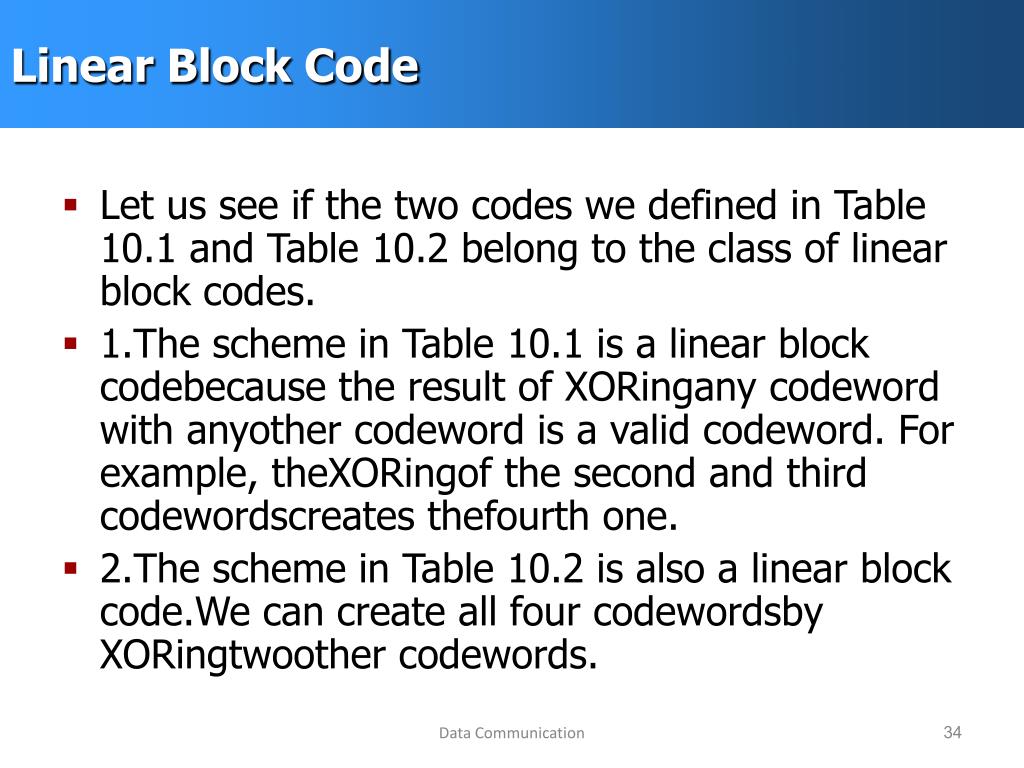 Linear Block Code • Let us see if the two codes we defined in Table 10.1 and Table 10.2 belong to the class of linear block codes. • 1.The scheme in Table 10.1 is a linear block codebecause the result of XORingany codeword with anyother codeword is a valid codeword. For example, theXORingof the second and third codewordscreates thefourth one. • 2.The scheme in Table 10.2 is also a linear block code.We can create all four codewordsby XORingtwoother codewords. Data Communication