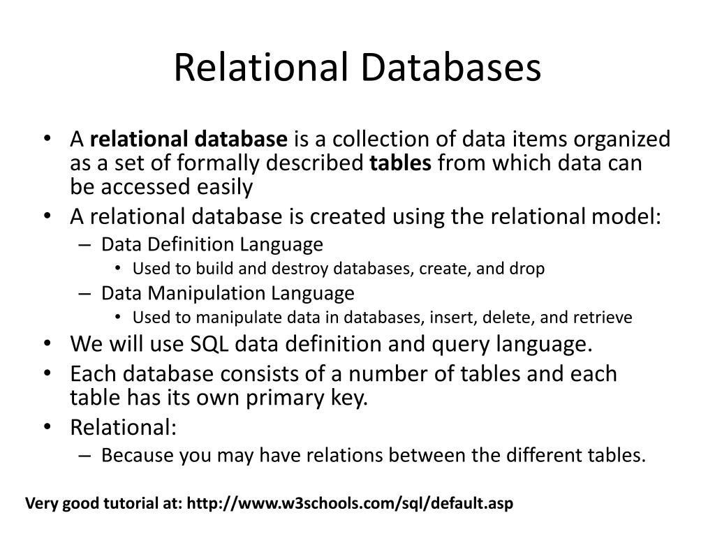 Relational Databases • A relational database is a collection of data items organized as a set of formally described tables from which data can be accessed easily • A relational database is created using the relational model: • Data Definition Language • Used to build and destroy databases, create, and drop • Data Manipulation Language • Used to manipulate data in databases, insert, delete, and retrieve • We will use SQL data definition and query language. • Each database consists of a number of tables and each table has its own primary key. • Relational: • Because you may have relations between the different tables. Very good tutorial at: http://www.w3schools.com/sql/default.asp