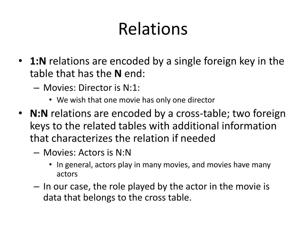 Relations • 1:Nrelations are encoded by a single foreign key in the table that has the N end: • Movies: Director is N:1: • We wish that one movie has only one director • N:Nrelations are encoded by a cross-table; two foreign keys to the related tables with additional information that characterizes the relation if needed • Movies: Actors is N:N • In general, actors play in many movies, and movies have many actors • In our case, the role played by the actor in the movie is data that belongs to the cross table.