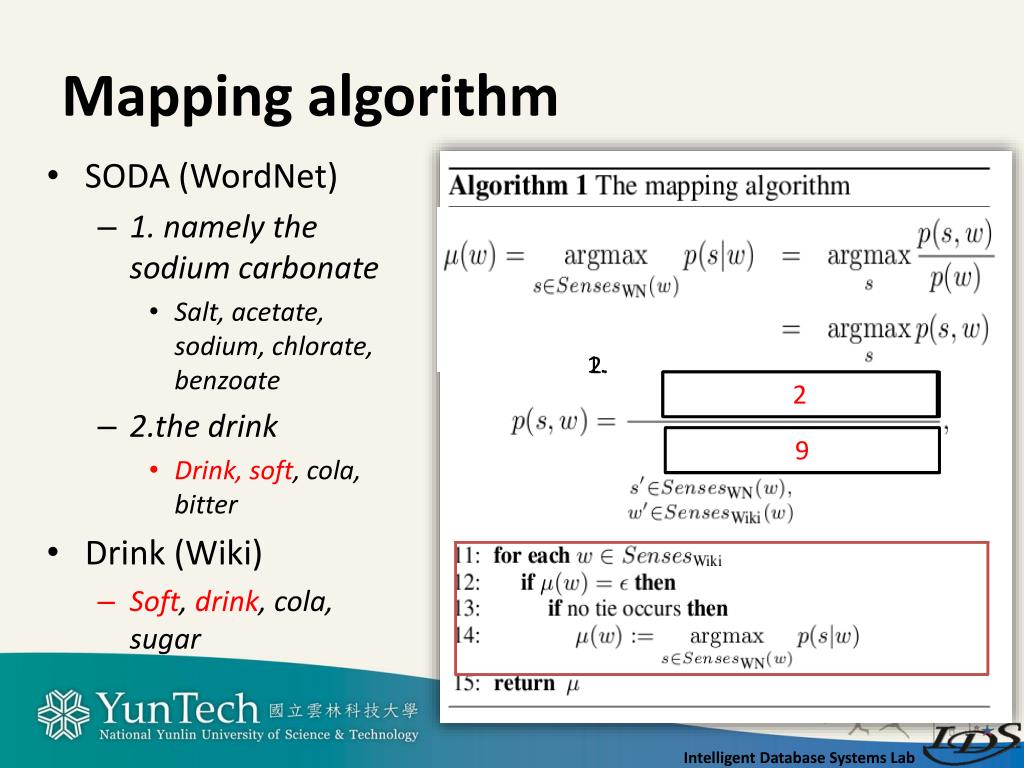 Mapping algorithm • SODA (WordNet) • 1. namely the sodium carbonate • Salt, acetate,sodium, chlorate, benzoate • 2.the drink • Drink, soft, cola, bitter • Drink (Wiki) • Soft, drink, cola, sugar 1. 2. 0 2 9 9