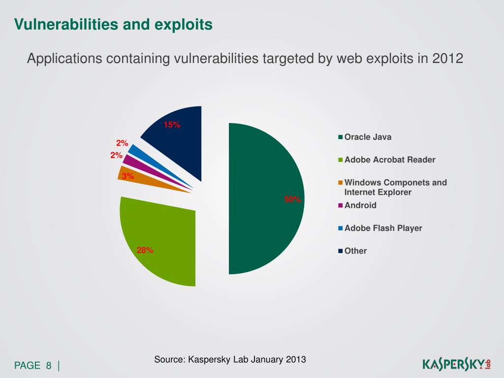 Vulnerabilities and exploits • Applications containing vulnerabilities targeted by web exploits in 2012 Source: Kaspersky Lab January 2013
