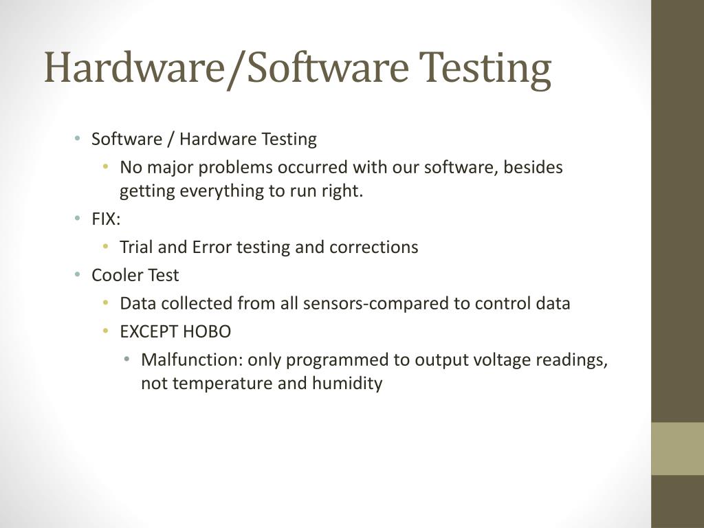 Hardware/Software Testing • Software / Hardware Testing • No major problems occurred with our software, besides getting everything to run right. • FIX: • Trial and Error testing and corrections • Cooler Test • Data collected from all sensors-compared to control data • EXCEPT HOBO • Malfunction: only programmed to output voltage readings, not temperature and humidity