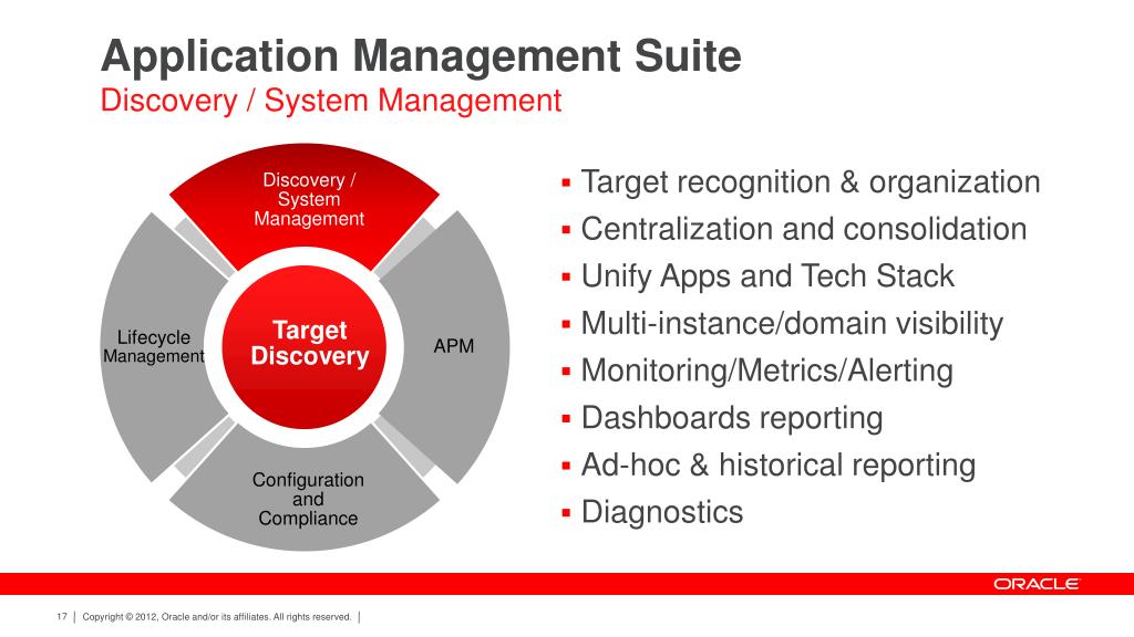 Application Management Suite Discovery / System Management Discovery / System Management • Target recognition & organization • Centralization and consolidation • Unify Apps and Tech Stack • Multi-instance/domain visibility • Monitoring/Metrics/Alerting • Dashboards reporting • Ad-hoc & historical reporting • Diagnostics Target Discovery Lifecycle Management APM Configuration and Compliance