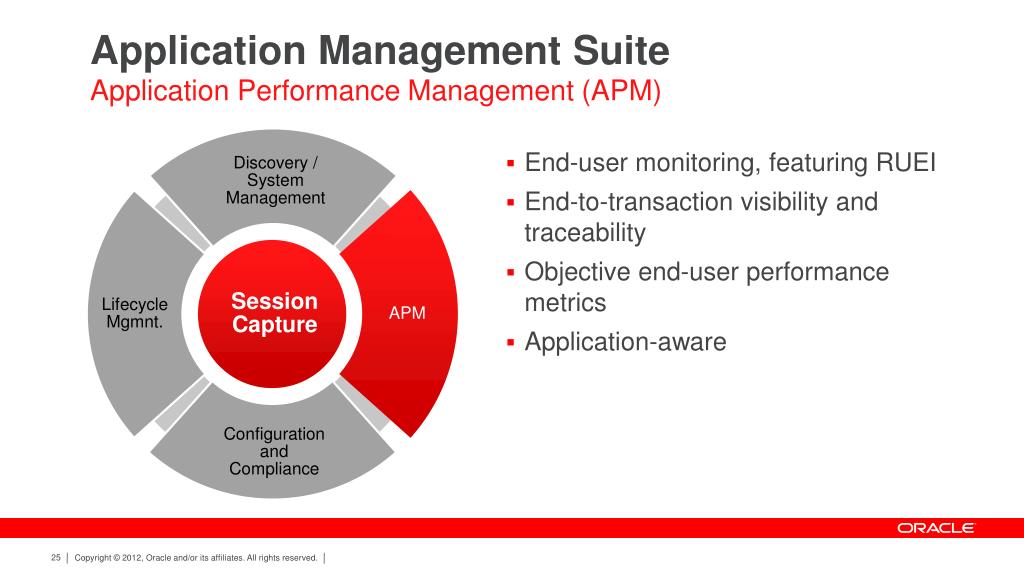 Application Management Suite Application Performance Management (APM) Discovery / System Management • End-user monitoring, featuring RUEI • End-to-transaction visibility and traceability • Objective end-user performance metrics • Application-aware Session Capture Lifecycle Mgmnt. APM Configuration and Compliance
