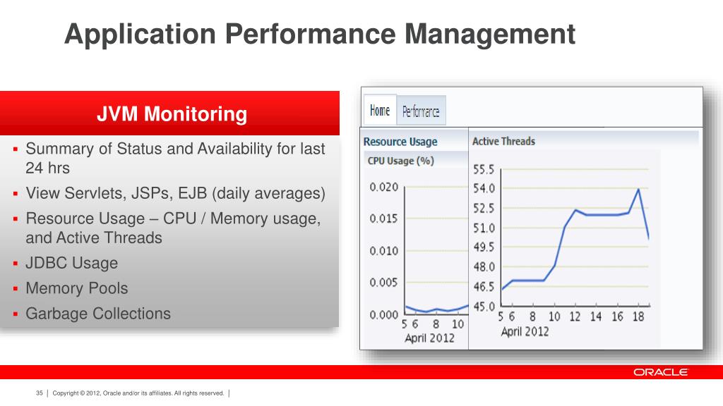 Application Performance Management • Summary of Status and Availability for last 24 hrs • View Servlets, JSPs, EJB (daily averages) • Resource Usage – CPU / Memory usage, and Active Threads • JDBC Usage • Memory Pools • Garbage Collections • JVM Monitoring