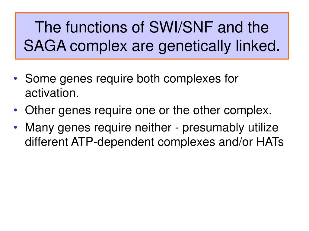The functions of SWI/SNF and the SAGA complex are genetically linked. • Some genes require both complexes for activation. • Other genes require one or the other complex. • Many genes require neither - presumably utilize different ATP-dependent complexes and/or HATs