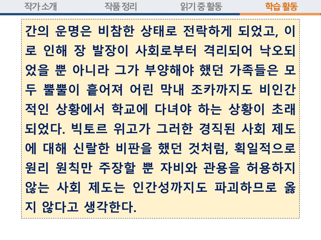 학습 목표 • ‘레미제라블’은 주인공 장 발장의 삶과 그의 삶에 영향을 미치는 사회를 치밀하게 묘사한 작품이다. 작품을 읽고 인간과 세계의 모습을 통해 아름다움과 추함, 숭고함과 비속함 등의 미적 인식을 경험해 보자. 또 수치나 추상적 논리로는 설명할 수 없는 삶의 진실을 문학이 어떻게 표현해 내는지 파악하여 보자.