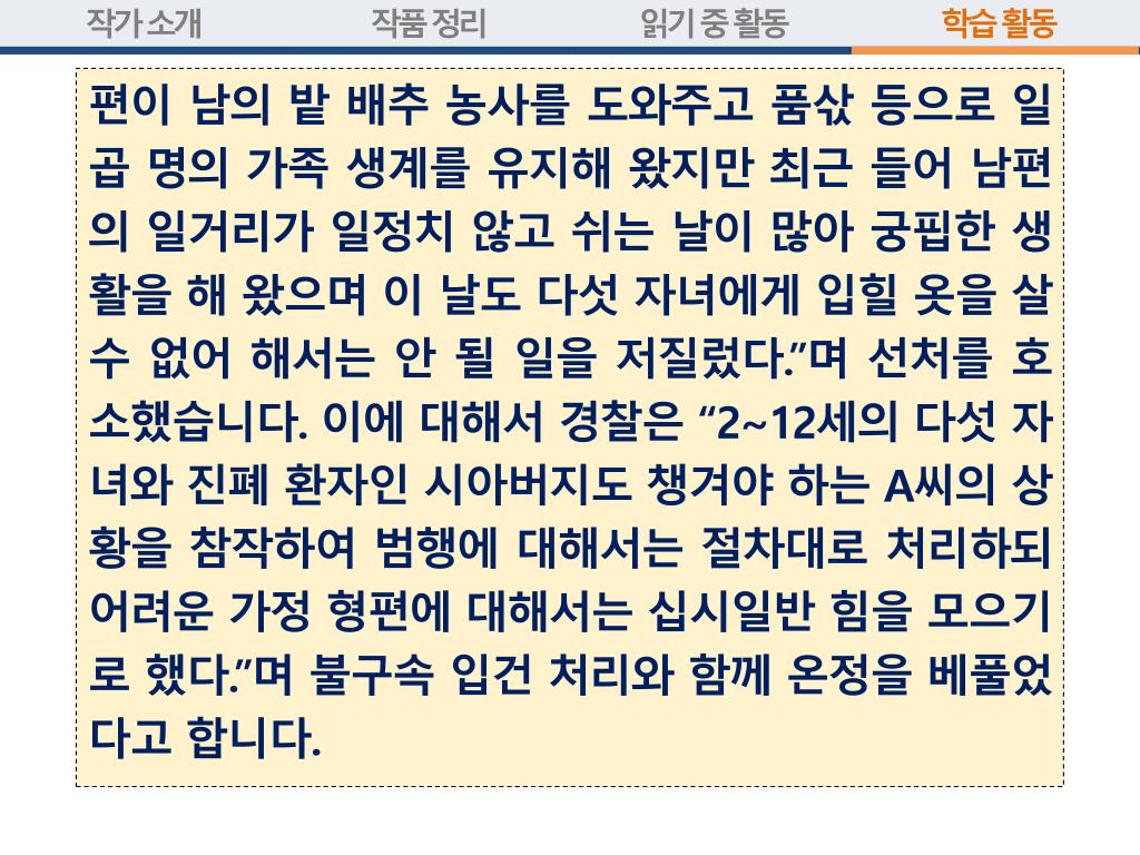 편이 남의 밭 배추 농사를 도와주고 품삯 등으로 일곱 명의 가족 생계를 유지해 왔지만 최근 들어 남편의 일거리가 일정치 않고 쉬는 날이 많아 궁핍한 생활을 해 왔으며 이 날도 다섯 자녀에게 입힐 옷을 살 수 없어 해서는 안 될 일을 저질렀다.”며 선처를 호소했습니다. 이에 대해서 경찰은 “2~12세의 다섯 자녀와 진폐 환자인 시아버지도 챙겨야 하는 A씨의 상황을 참작하여 범행에 대해서는 절차대로 처리하되 어려운 가정 형편에 대해서는 십시일반 힘을 모으기로 했다.”며 불구속 입건 처리와 함께 온정을 베풀었다고 합니다.