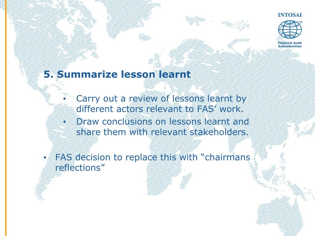 5. Summarize lesson learnt • Carry out a review of lessons learnt by different actors relevant to FAS’ work. • Draw conclusions on lessons learnt and share them with relevant stakeholders. • FAS decision to replace this with “chairmans reflections”