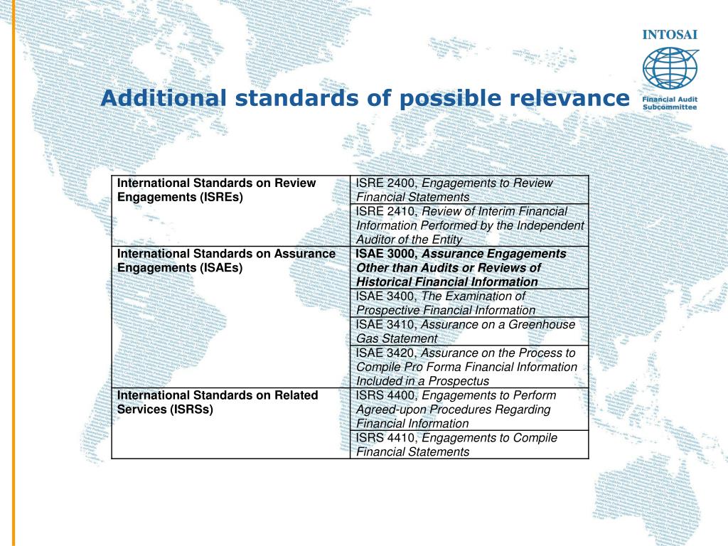 Other areas that might need guidance • Guidance for SAIs with responsibilities related to fraud in an audit of financial statements? • Guidance for SAIs with responsibilities related to environmental issues (sustainability reports) in an audit of financial statements? • Guidance for SAIs with responsibilities to report on internal controls in an audit of financial statements? • Guidance for Sais with responsibilities to perform Budget Execution Audits?