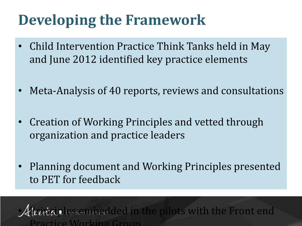 Developing the Framework • Child Intervention Practice Think Tanks held in May and June 2012 identified key practice elements • Meta-Analysis of 40 reports, reviews and consultations • Creation of Working Principles and vetted through organization and practice leaders • Planning document and Working Principles presented to PET for feedback • Principles embedded in the pilots with the Front end Practice Working Group