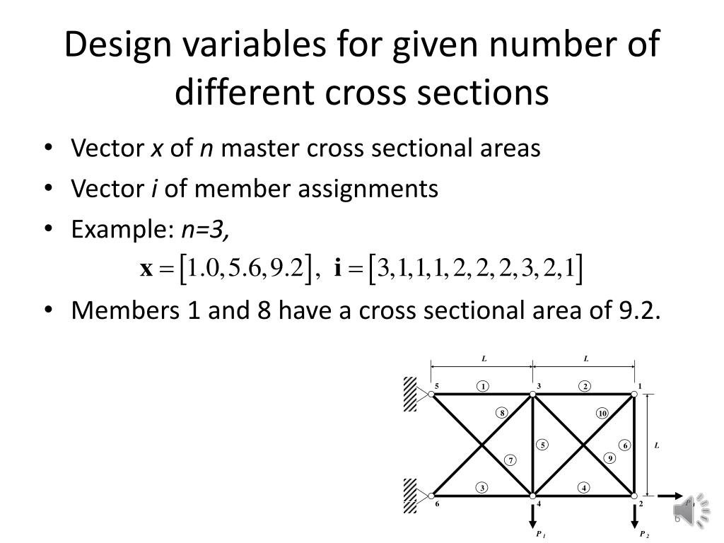 Design variables for given number of different cross sections • Vector x of n master cross sectional areas • Vector iof member assignments • Example: n=3, • Members 1 and 8 have a cross sectional area of 9.2.