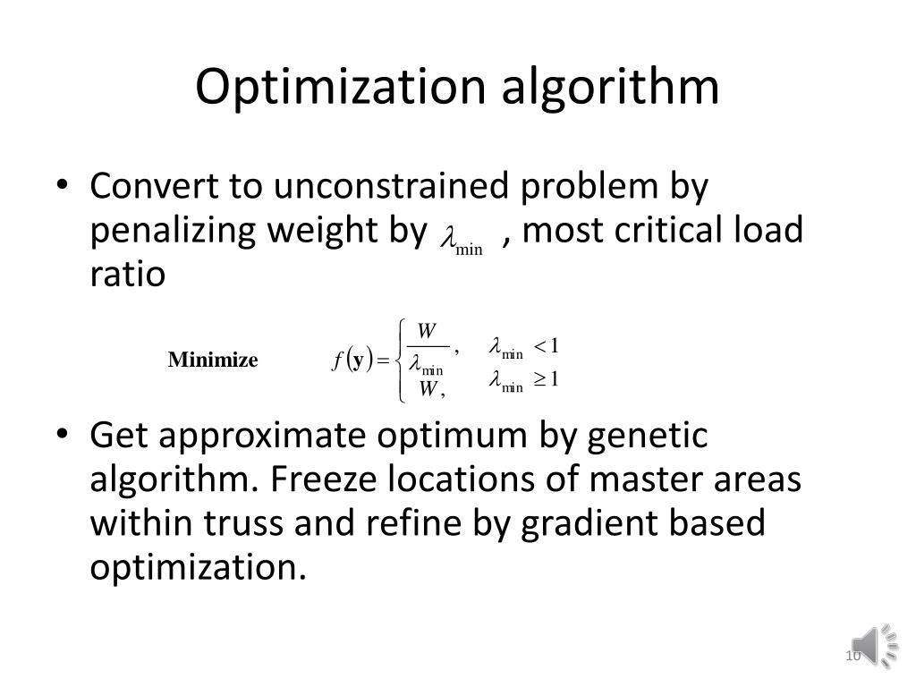 Optimization algorithm • Convert to unconstrained problem by penalizing weight by , most critical load ratio • Get approximate optimum by genetic algorithm. Freeze locations of master areas within truss and refine by gradient based optimization.