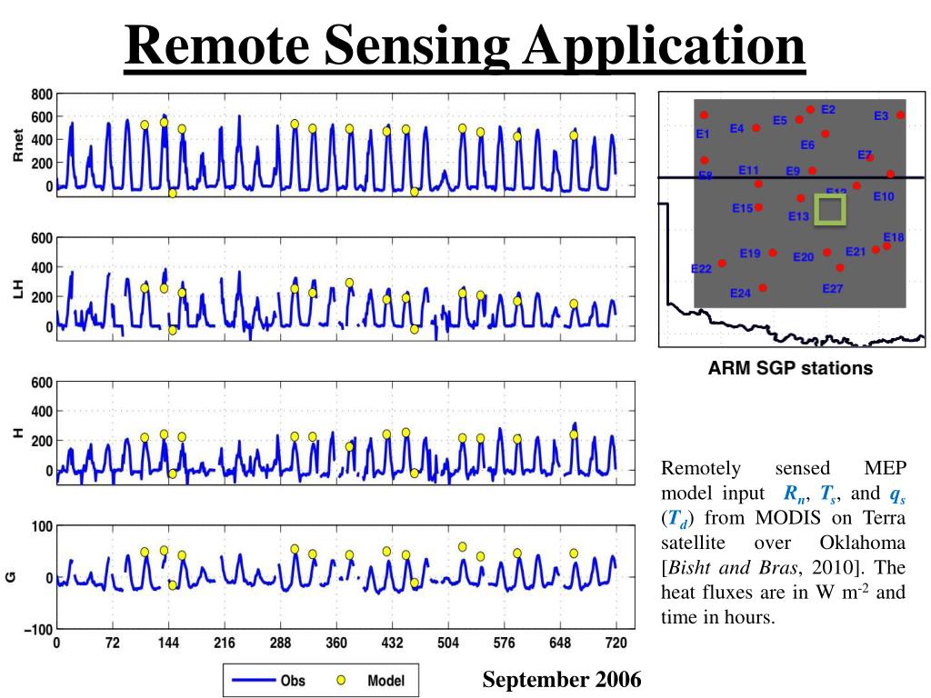 Remote Sensing Application • MODIS-Terra for Sept., 2006 Remotely sensed MEP model input Rn, Ts, and qs (Td) from MODIS on Terra satellite over Oklahoma [Bisht and Bras, 2010]. The heat fluxes are in W m-2 and time in hours. September 2006