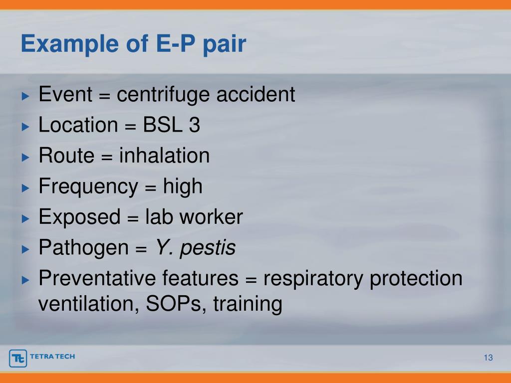 Example of E-P pair • Event = centrifuge accident • Location = BSL 3 • Route = inhalation • Frequency = high • Exposed = lab worker • Pathogen = Y. pestis • Preventative features = respiratory protection ventilation, SOPs, training